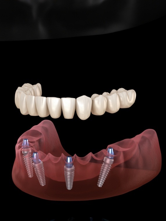 When an entire row of teeth is missing, there is no need to assume that traditional dentures are the only viable option. Instead, we can refer you to an implant dentist in the area who can place four to six posts into the jawbone to create a base for your implant dentures. Instead of relying on denture adhesive to hold your new teeth in place, your denture will be attached to implant posts that are securely fused to the jawbone.