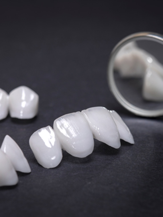 Dental veneers are ultra-thin porcelain or composite resin (Lumineers) shells designed to cover the front surfaces of problem teeth. They’re bonded in place to correct issues like discoloration, cracks, minor misalignment, and gaps. Veneers are highly durable and stain-resistant, making them a long-lasting way to improve the appearance of your smile.